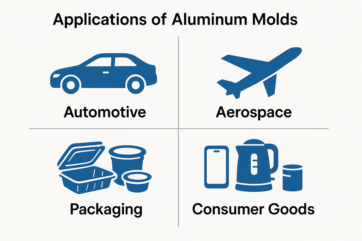 Aluminijski kalupi pronašli su svoj put u raznoliki raspon industrija, vođenih potrebom za bržim, isplativim i prilagodljivim proizvodnim procesima. Njihova jedinstvena svojstva čine ih preferiranim izborom za tvrtke koje žele pojednostaviti proizvodnju i brzo donositi nove proizvode na tržište.