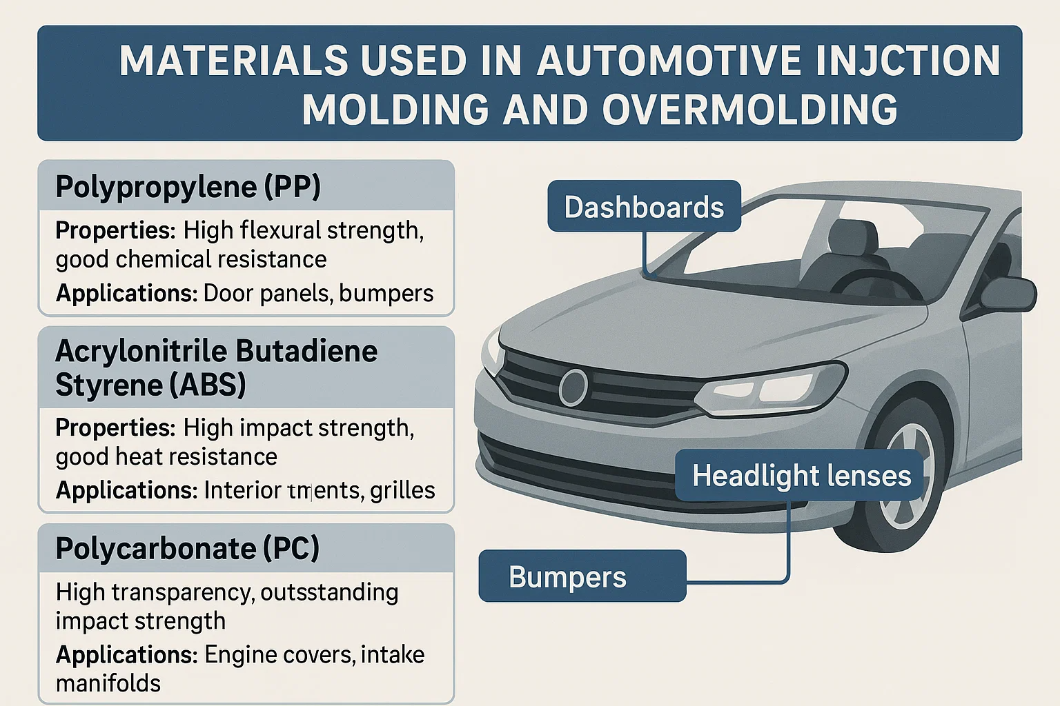 Odabir pravog materijala presudan je korak u proizvodnji automobilskog dijela. Diktira izvedbu komponente, izdržljivost, težinu i troškove. Koristi se ogroman niz plastike i elastomera, od kojih svaka ima jedinstvena svojstva koja odgovaraju za određene primjene.