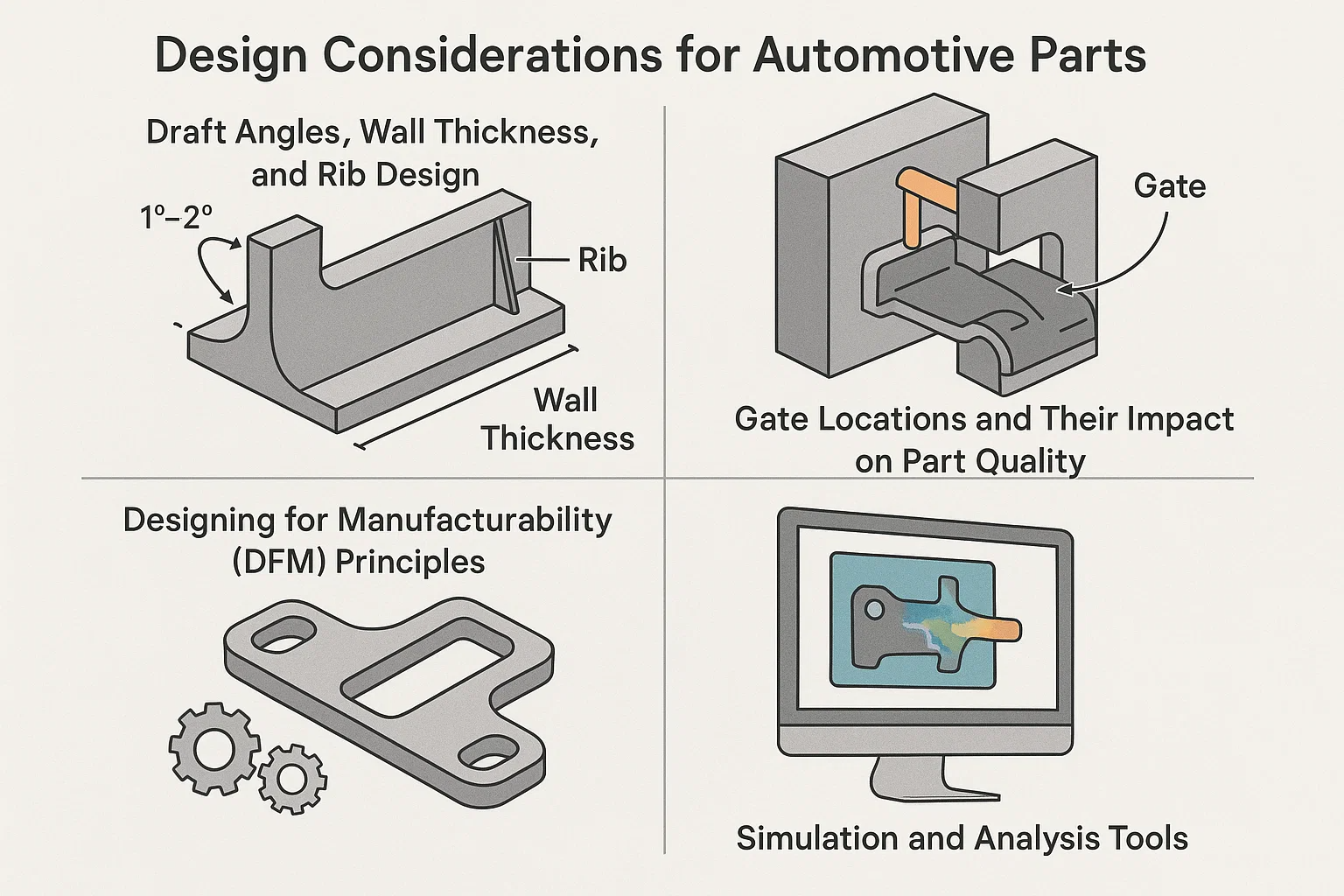 Moderni dizajn podržava napredni softver. Analiza protoka plijesni je alat za simulaciju ključa koji predviđa kako će se rastopljena plastika ulijevati u kalup. Pomaže dizajnerima da identificiraju potencijalne probleme poput oznaka sudopera, linije zavarivanja i zavarivanja prije nego što se ikada napravi fizički kalup, štedeći značajno vrijeme i novac. Ostali alati mogu simulirati stres, vibracije i toplinske performanse kako bi se osiguralo da dio ispunjava sve zahtjeve izdržljivosti.