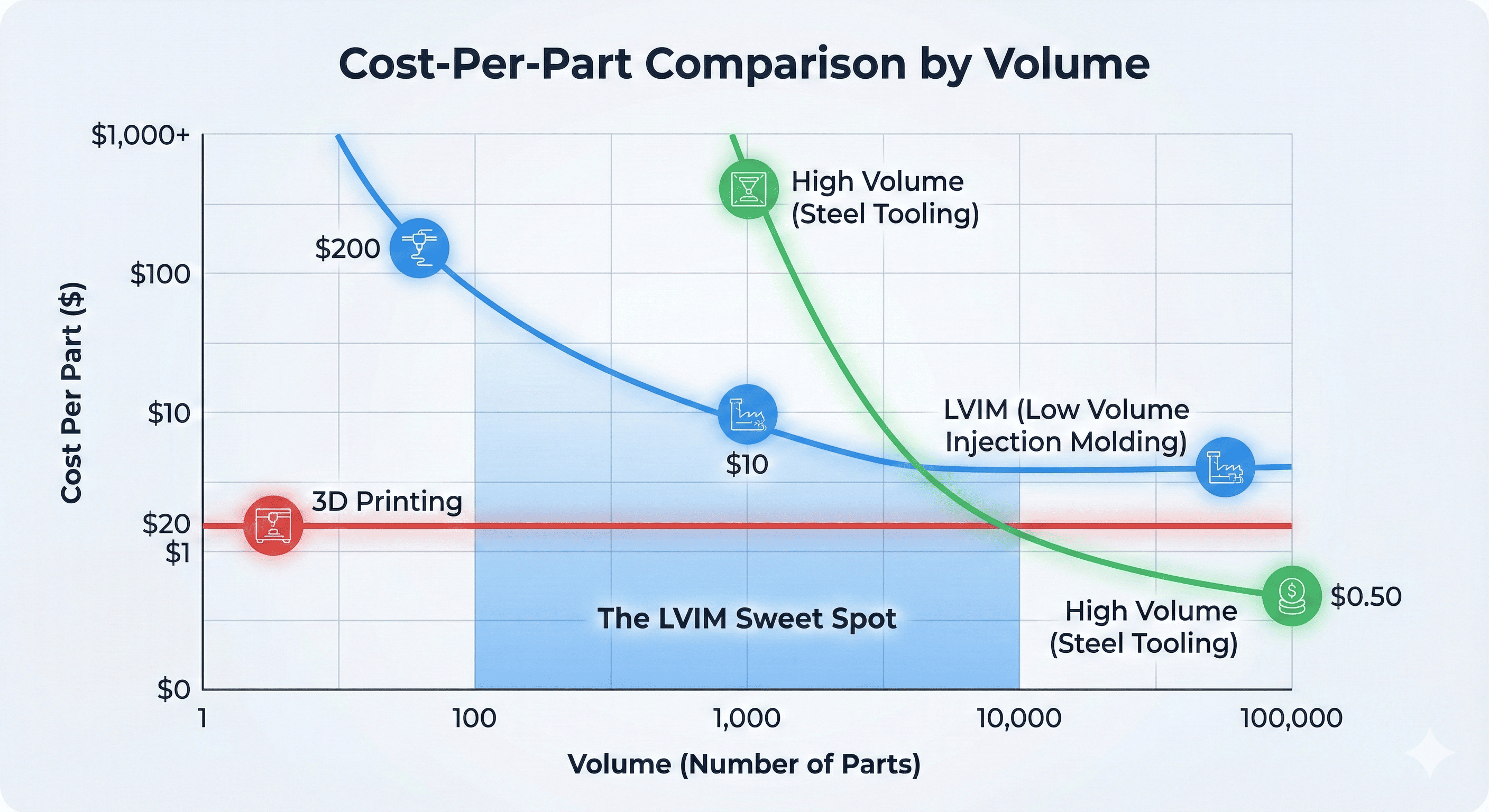 Zamislite LVIM kao agilnog rođaka masovne proizvodnje. Dok je tradicionalno oblikovanje opsjednuto "milijunima ciklusa", LVIM je dizajniran za 100 do 10 000 jedinica domet.