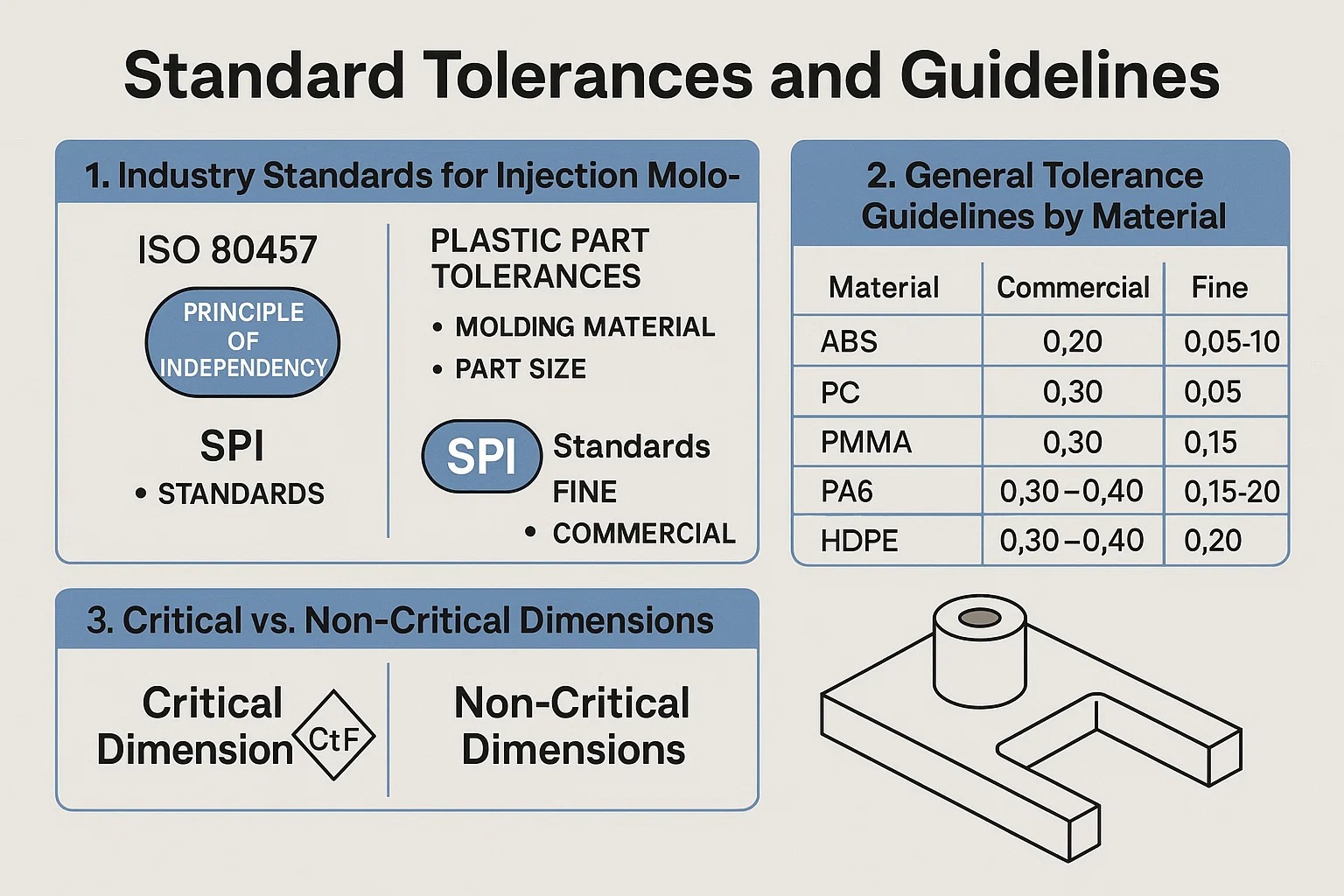Budući da su "savršene" dimenzije nemoguće, industrija se oslanja na utvrđene standarde kako bi definirala što je prihvatljivo. Ovi standardi pružaju zajednički jezik za inženjere i kalupare kako bi se dogovorili o očekivanjima kvalitete prije nego što se kalup uopće izreže.